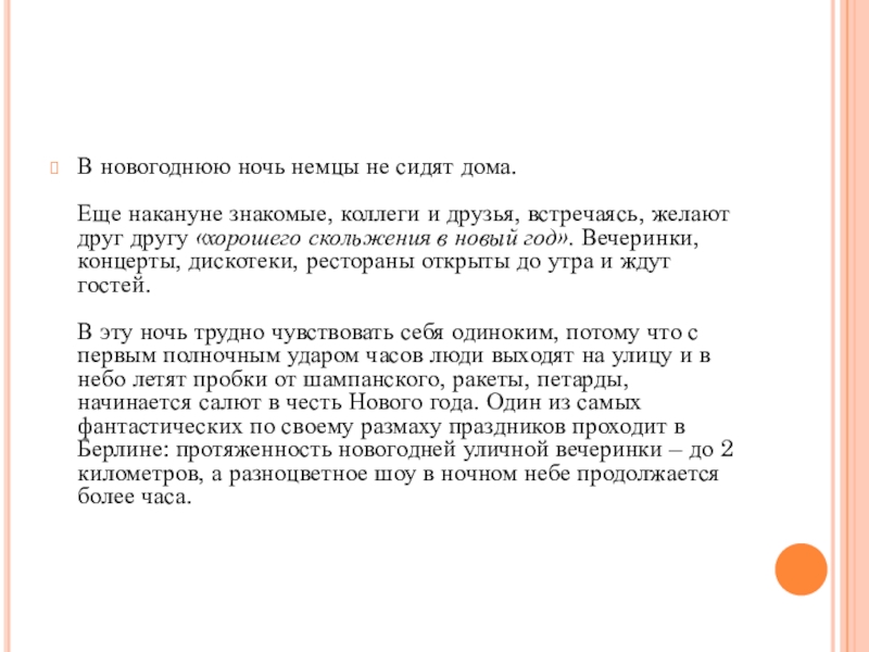 В эту ночь трудно чувствовать себя одиноким, потому что с первым полночным ударом часов люди выходят на улицу и в небо летят пробки от шампанского, ракеты, петарды, начинается салют в честь Нового года. Один из самых фантастических по своему размаху праздников проходит в Берлине: протяженность новогодней уличной вечеринки – до 2 километров, а разноцветное шоу в ночном небе продолжается более часа.