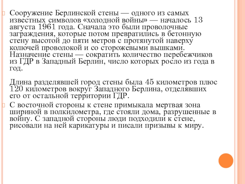 — началось 13 августа 1961 года. Сначала это были проволочные заграждения, которые потом превратились в бетонную стену высотой до пяти метров с протянутой наверху колючей проволокой и со сторожевыми вышками.