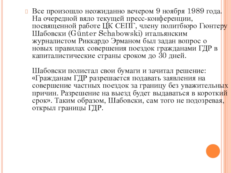 текущей пресс-конференции, посвященной работе ЦК СЕПГ, члену политбюро Гюнтеру Шабовски (Günter Schabowski) итальянским журналистом Риккардо Эрманом был задан вопрос о новых правилах совершения поездок гражданами ГДР в капиталистические страны сроком до 30 дней.