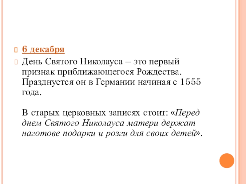 В старых церковных записях стоит: «Перед днем Святого Николауса матери держат наготове подарки и розги для своих детей».