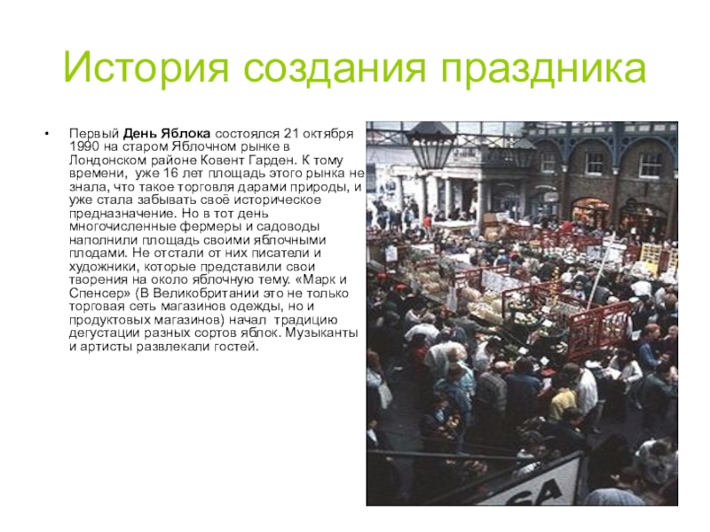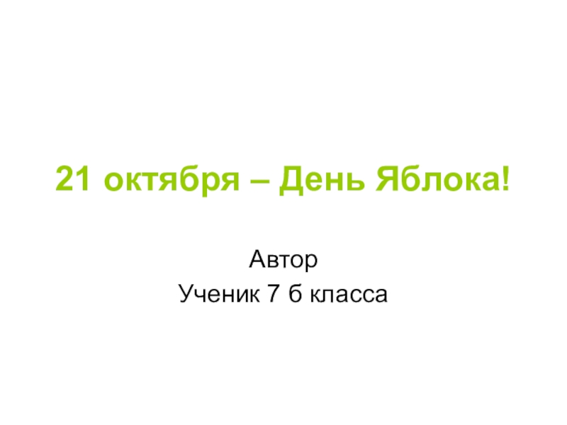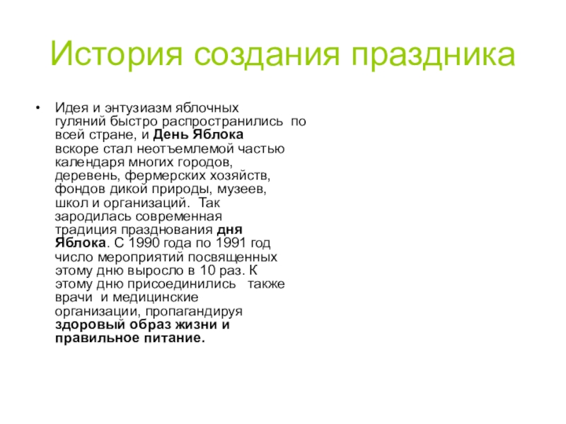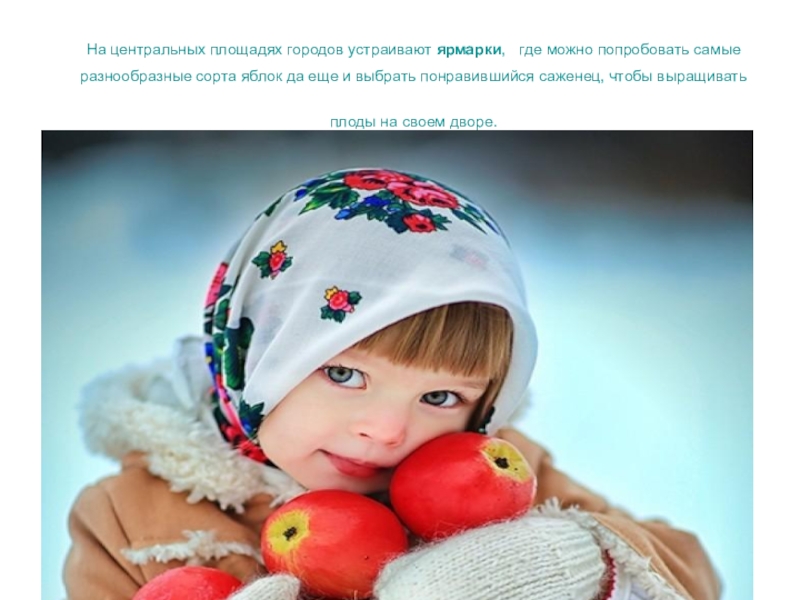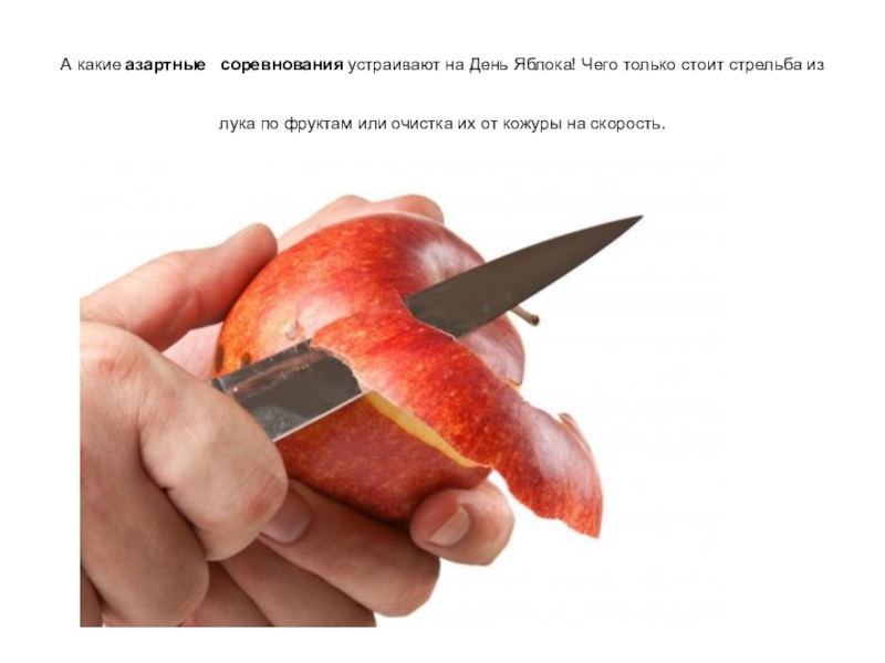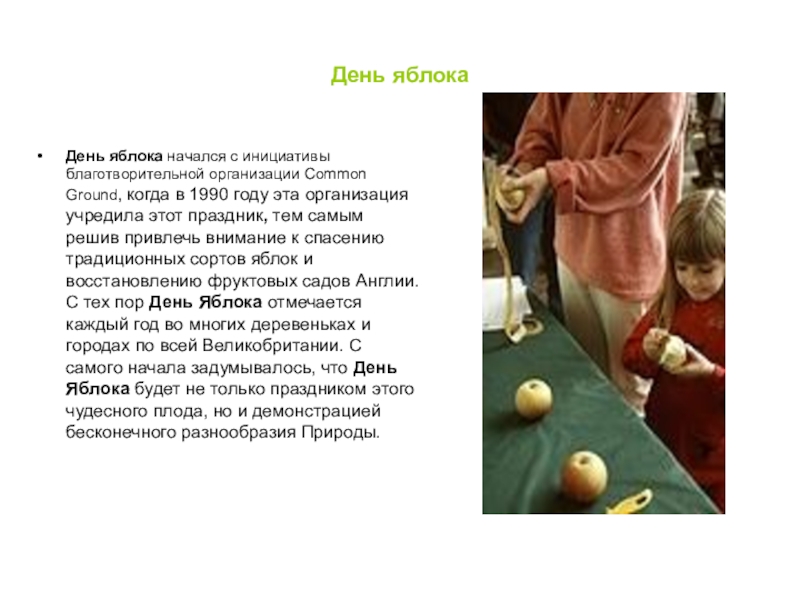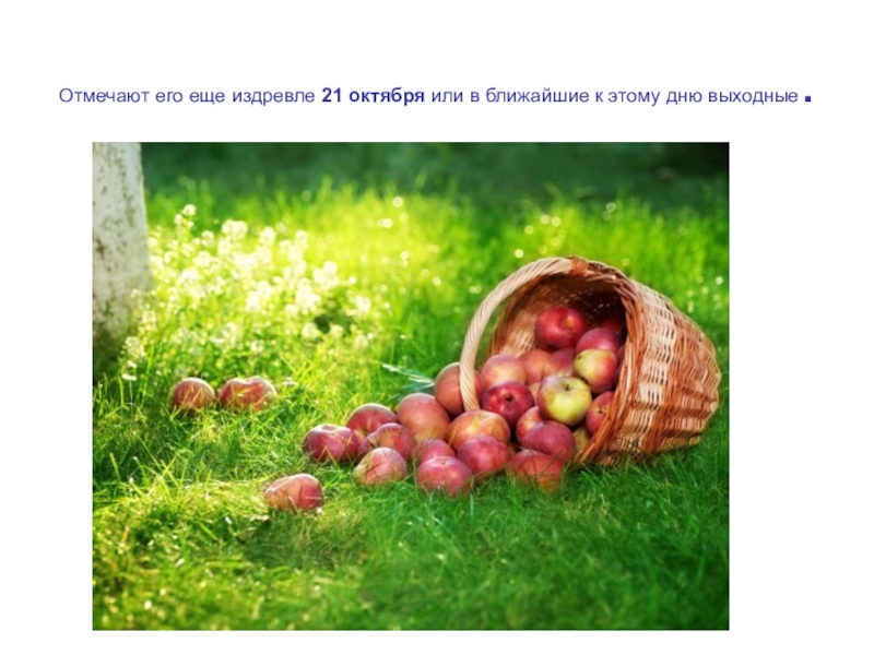 События, посвященные дню Яблока разнообразны: от небольших, локальных яблочных игр в саду, до больших ярмарок и фестивалей с обширной программой. Сейчас яблочные дни уже не привязывают строго к 21 октября, это могут быть ближайшие к этой дате выходные или другие дни второй половины второго месяца осени.