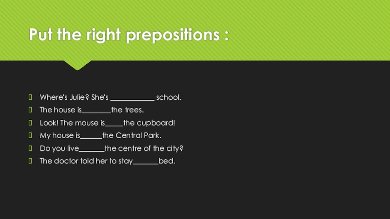 Put the right prepositions :Where's Julie? She's ____________ school.The house is________the trees.Look! The mouse is_____the cupboard!My house