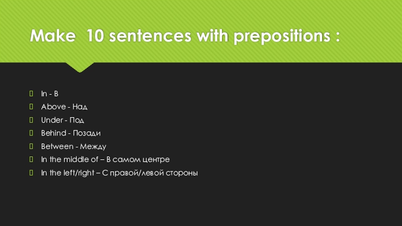 Make 10 sentences with prepositions :In - ВAbove - НадUnder - ПодBehind - ПозадиBetween - МеждуIn the