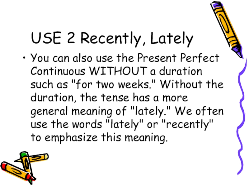 USE 2 Recently, Lately You can also use the Present Perfect Continuous WITHOUT a duration such as