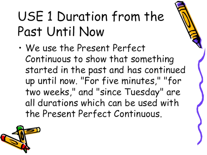 USE 1 Duration from the Past Until Now We use the Present Perfect Continuous to show that
