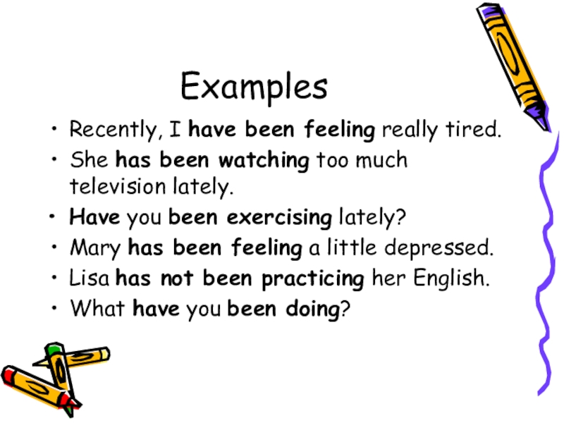 ExamplesRecently, I have been feeling really tired. She has been watching too much television lately. Have you