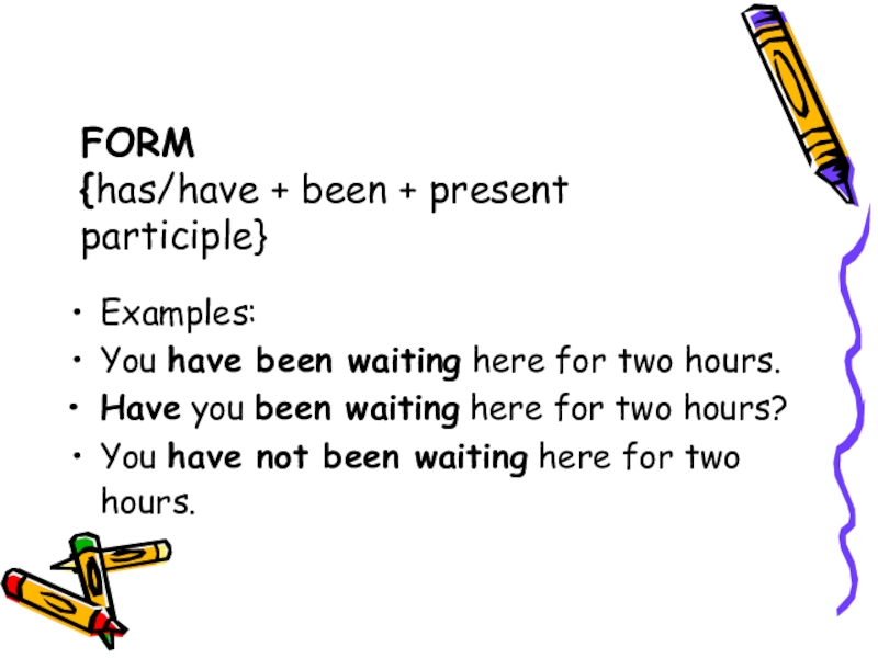 FORM {has/have + been + present participle}Examples:You have been waiting here for two hours. Have you been waiting here for two hours? You have not been waiting here for two hours.