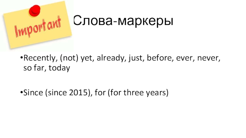 Слова-маркерыRecently, (not) yet, already, just, before, ever, never, so far, todaySince (since 2015), for (for three years)