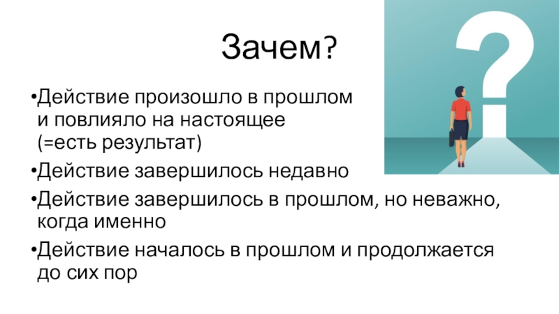 Зачем?Действие произошло в прошлом  и повлияло на настоящее  (=есть результат)Действие завершилось недавноДействие завершилось в прошлом,