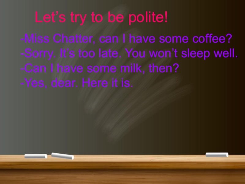 Let’s try to be polite!-Miss Chatter, can I have some coffee?-Sorry. It’s too late. You won’t sleep