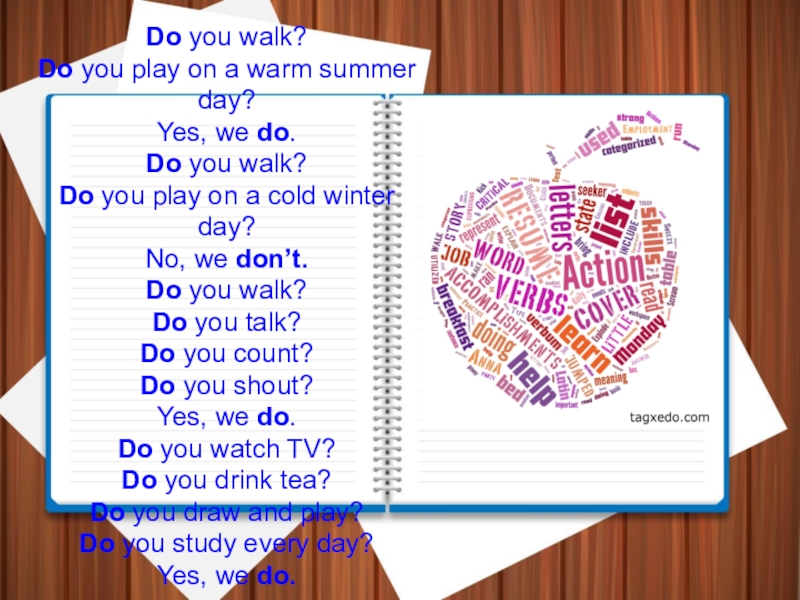 Do you walk?Do you play on a warm summer day?Yes, we do.Do you walk?Do you play on a cold winter day?No, we don’t.Do you walk?Do you talk?Do you count?Do you shout?Yes, we do.Do you watch TV?Do