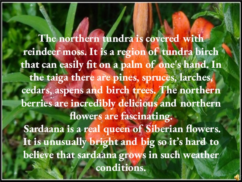 region of tundra birch that can easily fit on a palm of one's hand. In the taiga there are pines, spruces, larches, cedars, aspens and birch trees. The northern berries are incredibly delicious and northern flowers are fascinating. Sardaana is a real queen of Siberian flowers. It is unusually bright and big so it’s hard to believe that sardaana grows in such weather conditions.