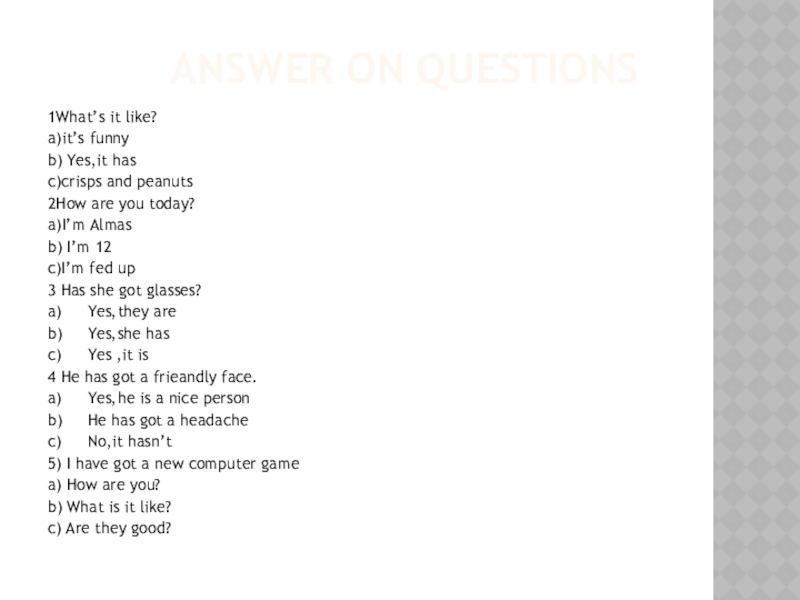 Answer on questions 1What’s it like? a)it’s funnyb) Yes,it hasc)crisps and peanuts2How