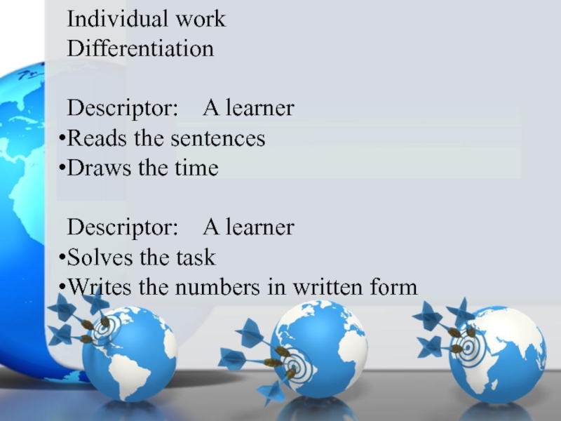 Individual workDifferentiationDescriptor:  A learnerReads the sentencesDraws the timeDescriptor:  A learnerSolves the taskWrites the numbers in