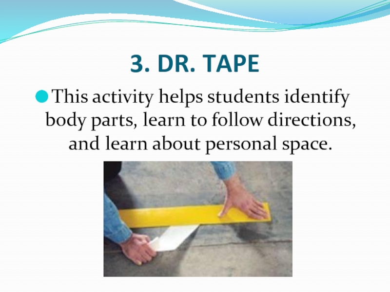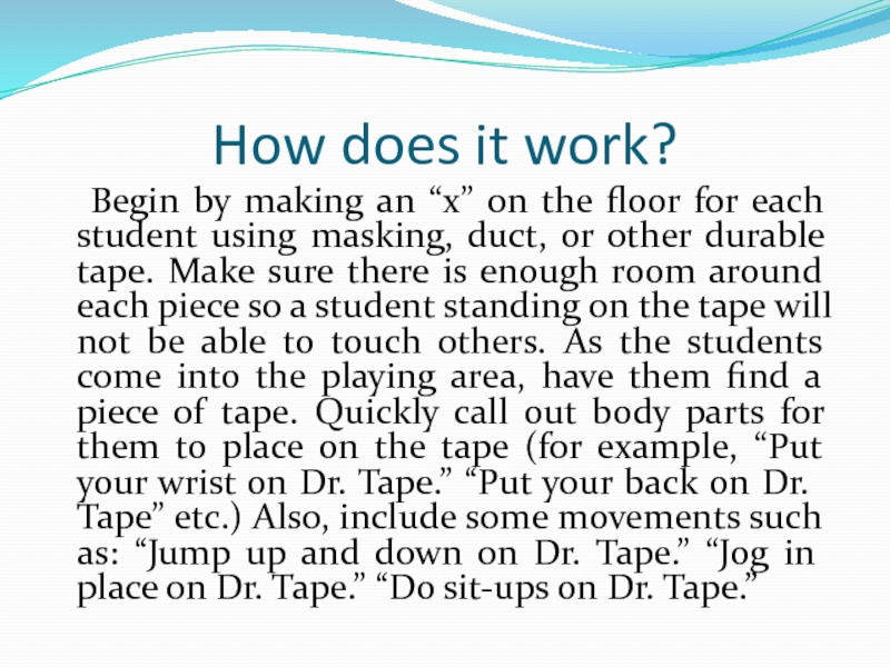 the floor for each student using masking, duct, or other durable tape. Make sure there is enough room around each piece so a student standing on the tape will not be able to touch others. As the students come into the playing area, have them find a piece of tape. Quickly call out body parts for them to place on the tape (for example, “Put your wrist on Dr. Tape.” “Put your back on Dr. Tape” etc.) Also, include some movements such as: “Jump up and down on Dr. Tape.” “Jog in place on Dr. Tape.” “Do sit-ups on Dr. Tape.”
