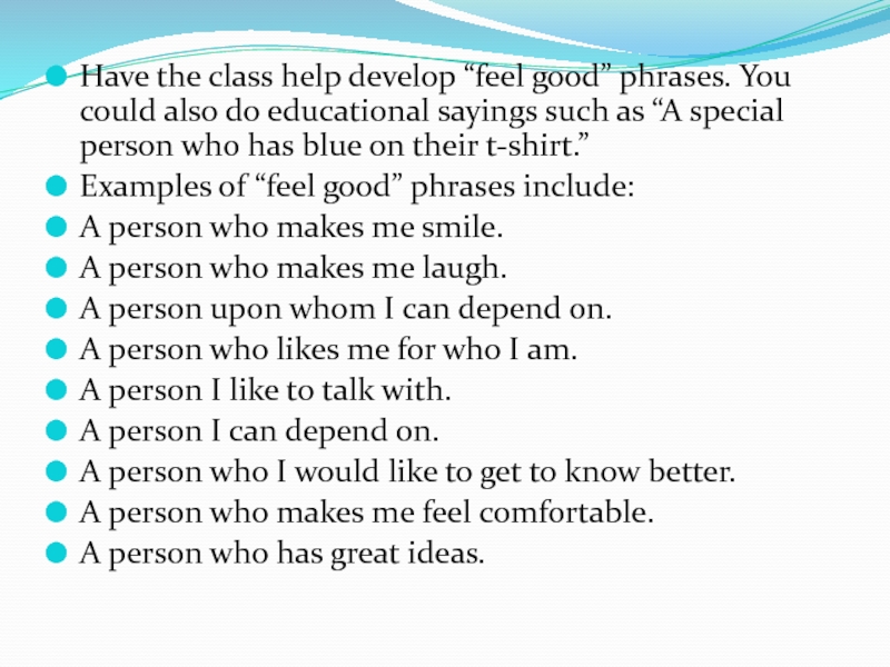 Слайд 19Have the class help develop “feel good” phrases. You could also