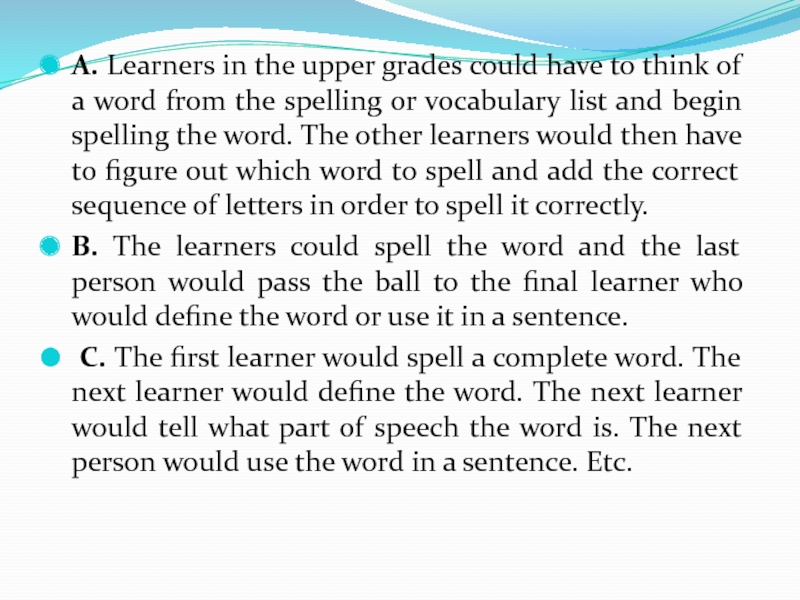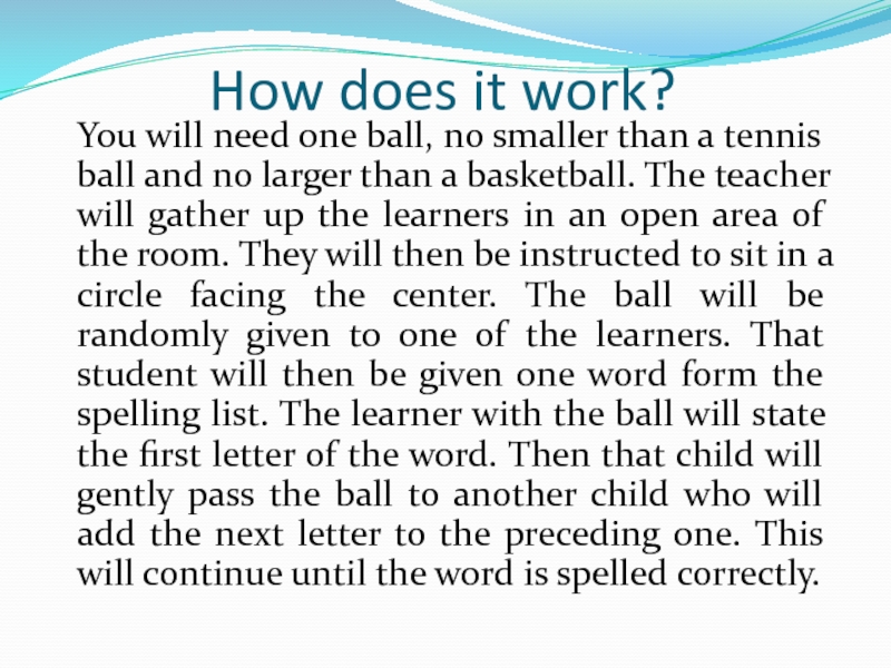 smaller than a tennis ball and no larger than a basketball. The teacher will gather up the learners in an open area of the room. They will then be instructed to sit in a circle facing the center. The ball will be randomly given to one of the learners. That student will then be given one word form the spelling list. The learner with the ball will state the first letter of the word. Then that child will gently pass the ball to another child who will add the next letter to the preceding one. This will continue until the word is spelled correctly.