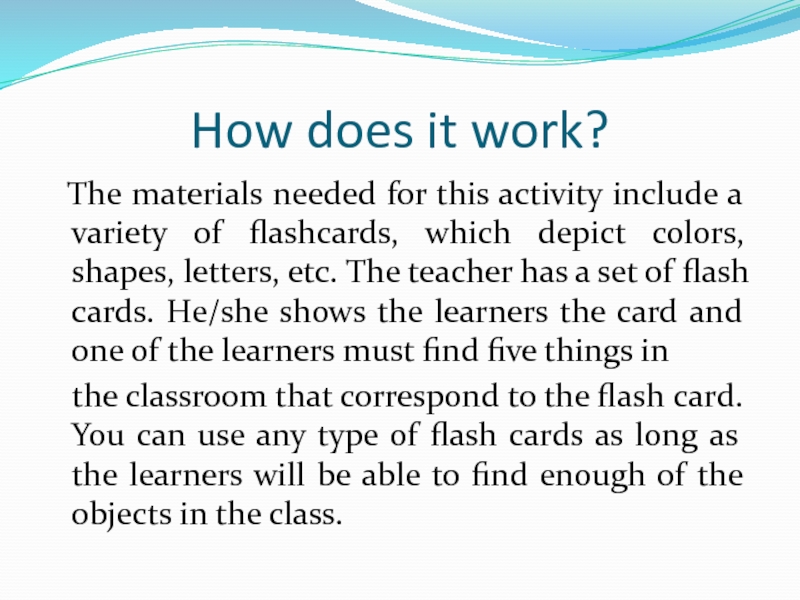 the classroom that correspond to the flash card. You can use any type of flash cards as long as the learners will be able to find enough of the objects in the class.