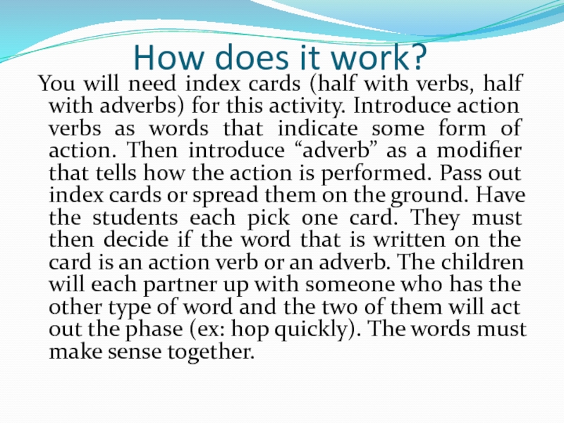 verbs, half with adverbs) for this activity. Introduce action verbs as words that indicate some form of action. Then introduce “adverb” as a modifier that tells how the action is performed. Pass out index cards or spread them on the ground. Have the students each pick one card. They must then decide if the word that is written on the card is an action verb or an adverb. The children will each partner up with someone who has the other type of word and the two of them will act out the phase (ex: hop quickly). The words must make sense together.
