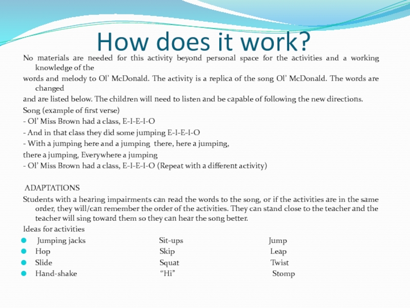 Students with a hearing impairments can read the words to the song, or if the activities are in the same order, they will/can remember the order of the activities. They can stand close to the teacher and the teacher will sing toward them so they can hear the song better.