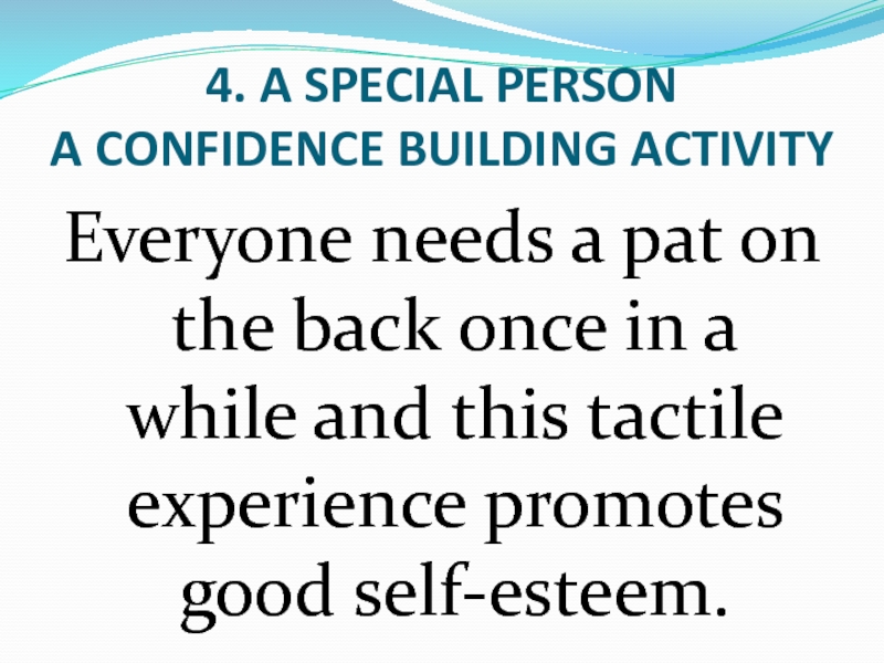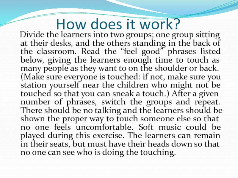 one group sitting at their desks, and the others standing in the back of the classroom. Read the “feel good” phrases listed below, giving the learners enough time to touch as many people as they want to on the shoulder or back. (Make sure everyone is touched: if not, make sure you station yourself near the children who might not be touched so that you can sneak a touch.) After a given number of phrases, switch the groups and repeat. There should be no talking and the learners should be shown the proper way to touch someone else so that no one feels uncomfortable. Soft music could be played during this exercise. The learners can remain in their seats, but must have their heads down so that no one can see who is doing the touching.