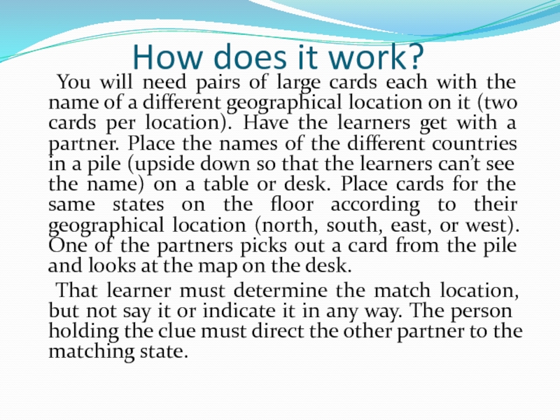 cards each with the name of a different geographical location on it (two cards per location). Have the learners get with a partner. Place the names of the different countries in a pile (upside down so that the learners can’t see the name) on a table or desk. Place cards for the same states on the floor according to their geographical location (north, south, east, or west). One of the partners picks out a card from the pile and looks at the map on the desk.