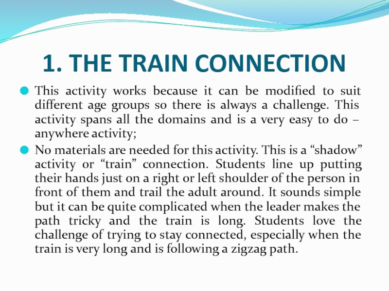 No materials are needed for this activity. This is a “shadow” activity or “train” connection. Students line up putting their hands just on a right or left shoulder of the person in front of them and trail the adult around. It sounds simple but it can be quite complicated when the leader makes the path tricky and the train is long. Students love the challenge of trying to stay connected, especially when the train is very long and is following a zigzag path.