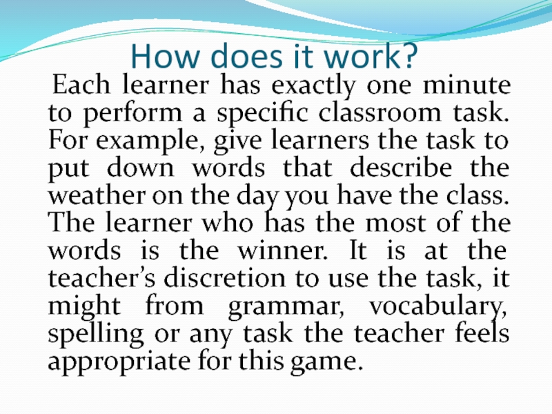 perform a specific classroom task. For example, give learners the task to put down words that describe the weather on the day you have the class. The learner who has the most of the words is the winner. It is at the teacher’s discretion to use the task, it might from grammar, vocabulary, spelling or any task the teacher feels appropriate for this game.