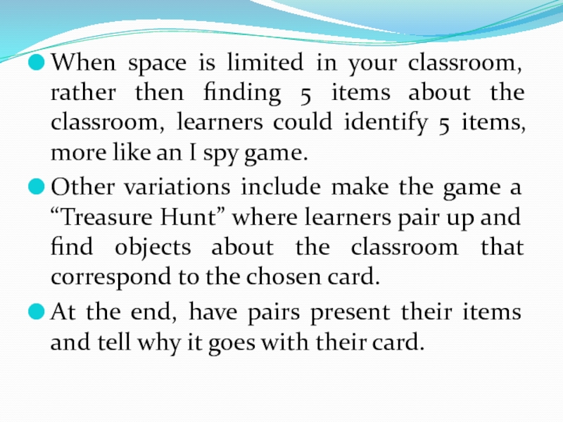 items about the classroom, learners could identify 5 items, more like an I spy game.