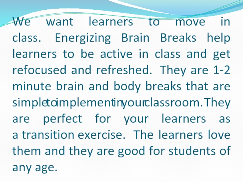 Слайд 5We want learners to move in class. Energizing Brain Breaks help