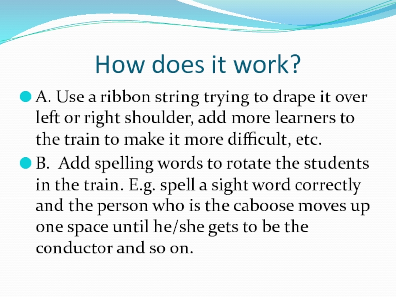 B. Add spelling words to rotate the students in the train. E.g. spell a sight word correctly and the person who is the caboose moves up one space until he/she gets to be the conductor and so on.