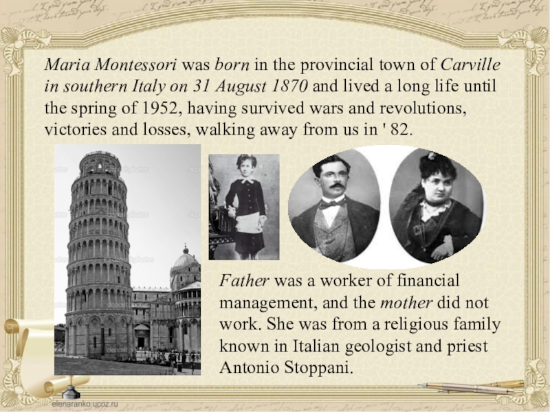 Father was a worker of financial management, and the mother did not work. She was from a religious family known in Italian geologist and priest Antonio Stoppani.