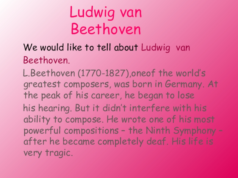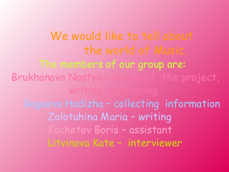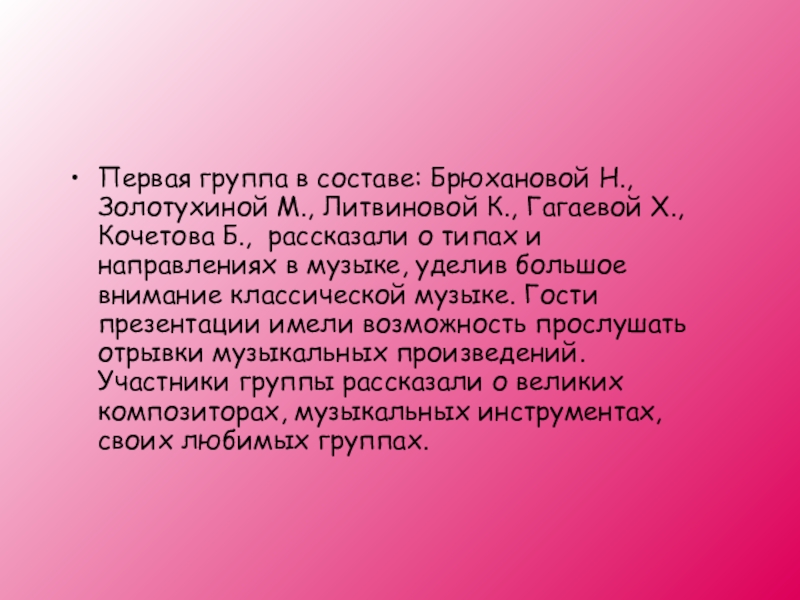 Х., Кочетова Б., рассказали о типах и направлениях в музыке, уделив большое внимание классической музыке. Гости презентации имели возможность прослушать отрывки музыкальных произведений. Участники группы рассказали о великих композиторах, музыкальных инструментах, своих любимых группах.