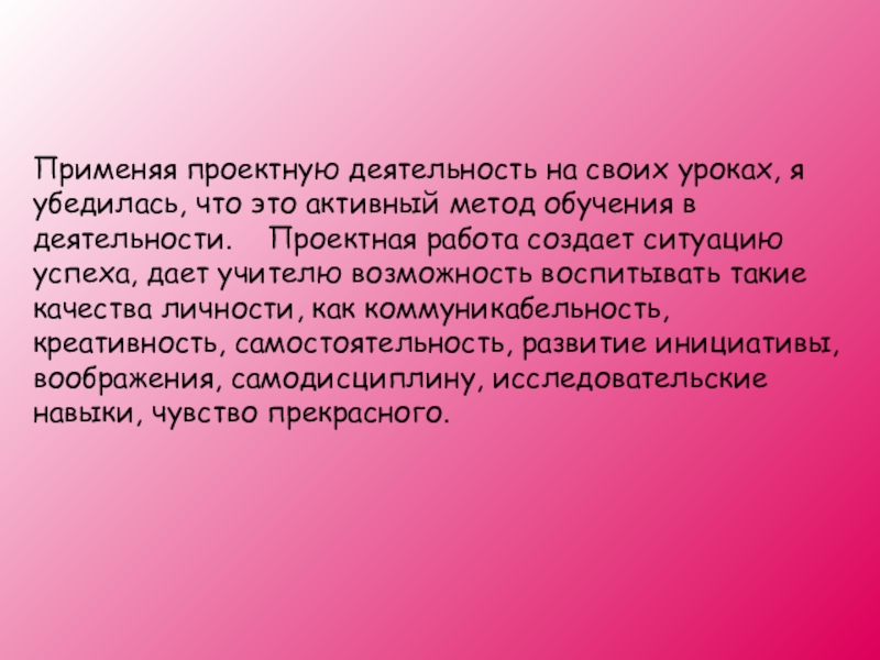 метод обучения в деятельности. Проектная работа создает ситуацию успеха, дает учителю возможность воспитывать такие качества личности, как коммуникабельность, креативность, самостоятельность, развитие инициативы, воображения, самодисциплину, исследовательские навыки, чувство прекрасного.