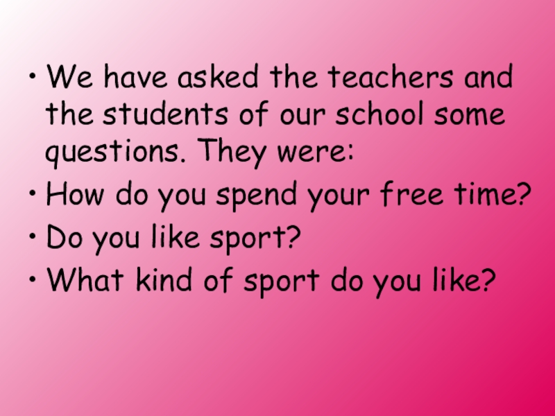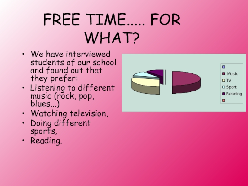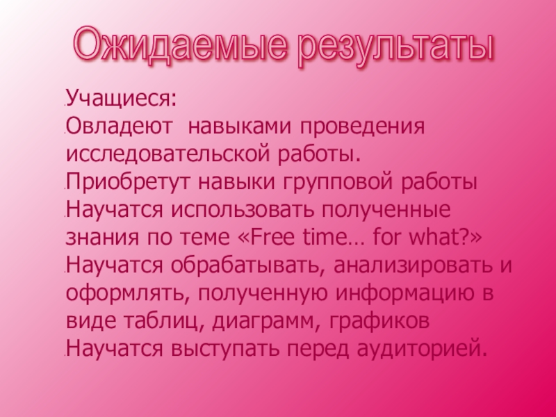 работы над проектами каждая группа провела анкетирование, и опрос учащихся нашей школы о том, как они любят проводить свободное время. И вот, наконец, наступил долгожданный момент презентации. Используя мультимедийное проектирование, группы представляли гостям свои проекты.
