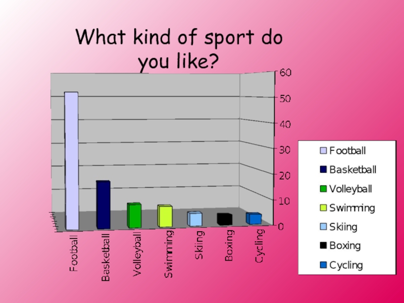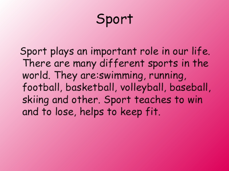 many different sports in the world. They are:swimming, running, football, basketball, volleyball, baseball, skiing and other. Sport teaches to win and to lose, helps to keep fit.
