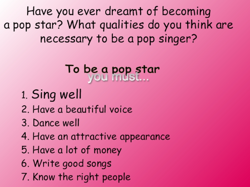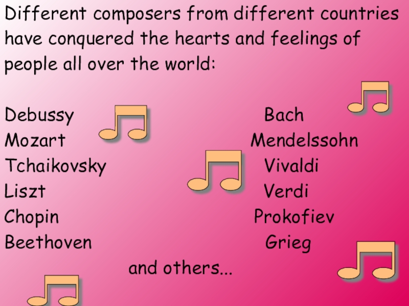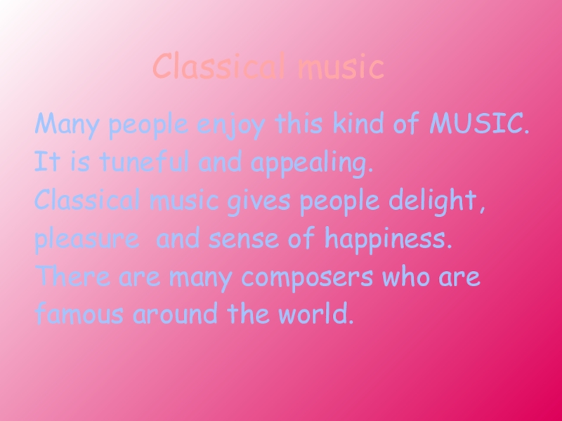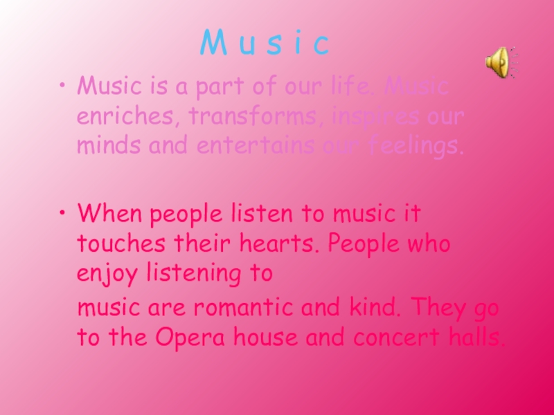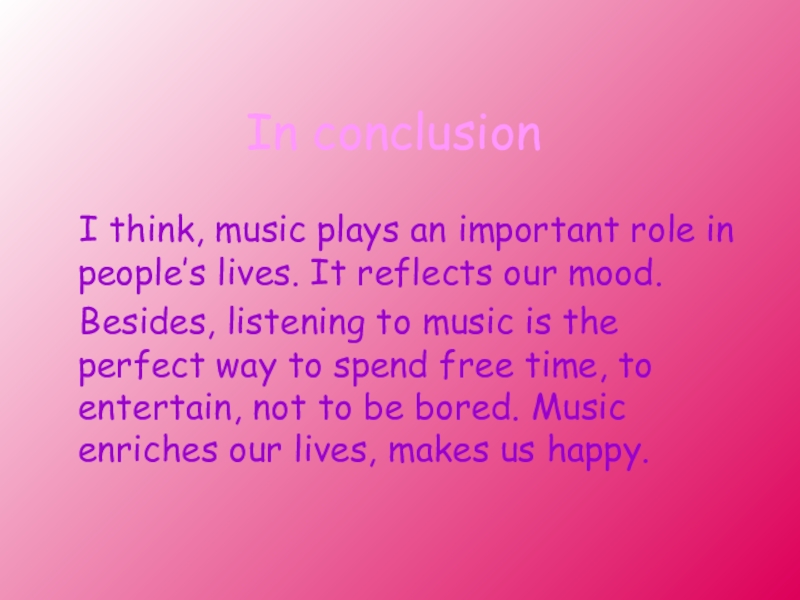 Besides, listening to music is the perfect way to spend free time, to entertain, not to be bored. Music enriches our lives, makes us happy.