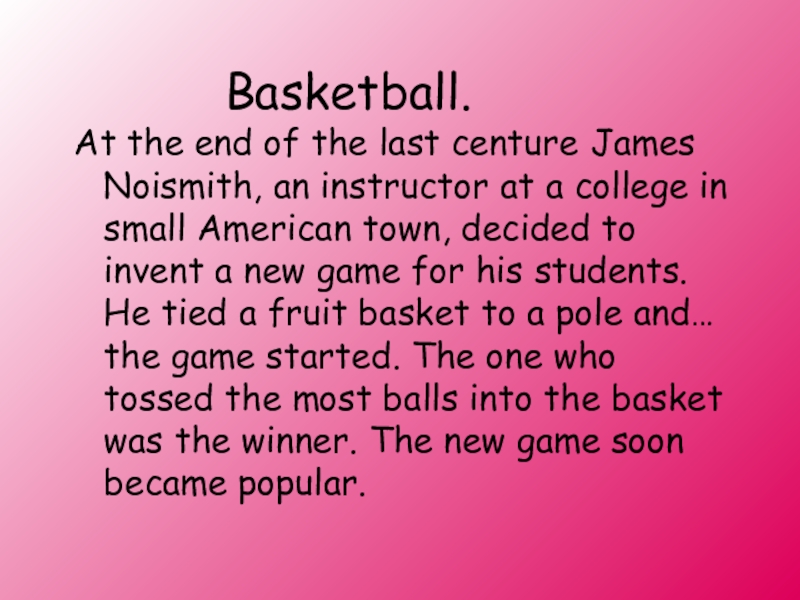 at a college in small American town, decided to invent a new game for his students. He tied a fruit basket to a pole and… the game started. The one who tossed the most balls into the basket was the winner. The new game soon became popular.