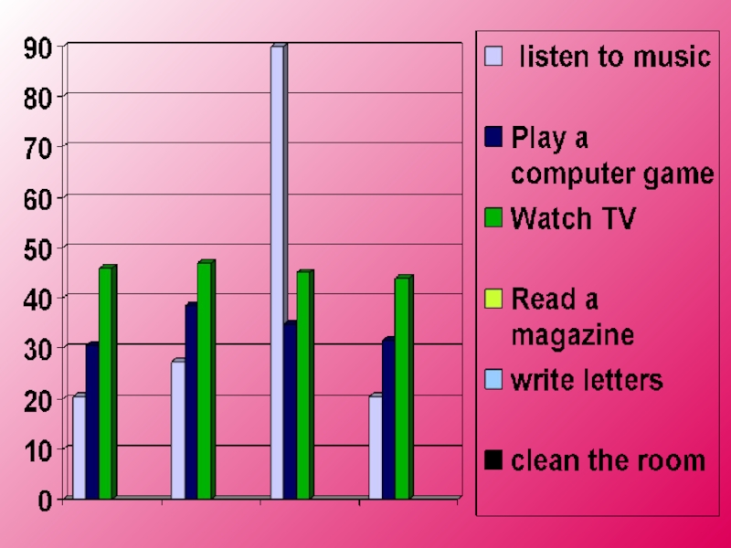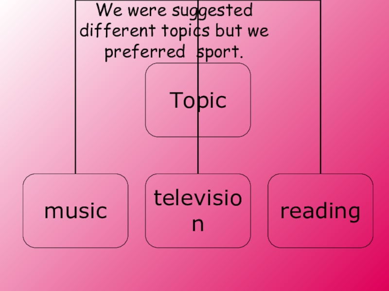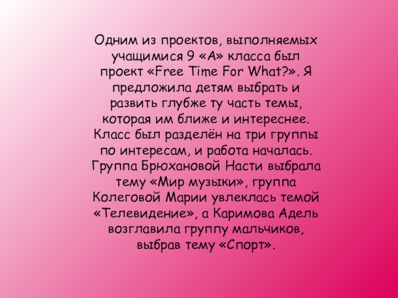Класс был разделён на три группы по интересам, и работа началась. Группа Брюхановой Насти выбрала тему «Мир музыки», группа Колеговой Марии увлеклась темой «Телевидение», а Каримова Адель возглавила группу мальчиков, выбрав тему «Спорт».