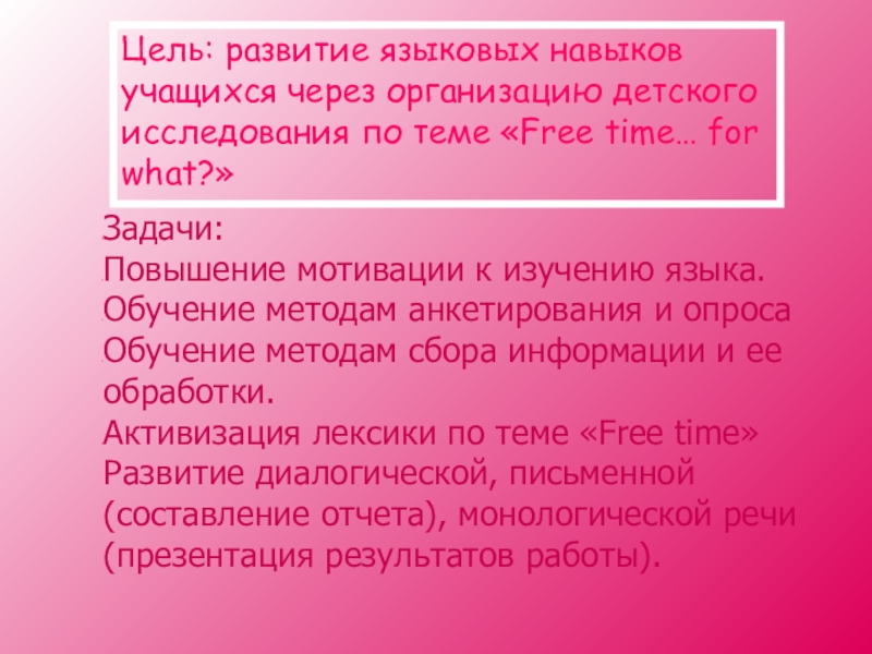 Слайд 5Цель: развитие языковых навыков учащихся через организацию детского исследования по теме