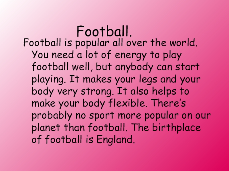 of energy to play football well, but anybody can start playing. It makes your legs and your body very strong. It also helps to make your body flexible. There’s probably no sport more popular on our planet than football. The birthplace of football is England.