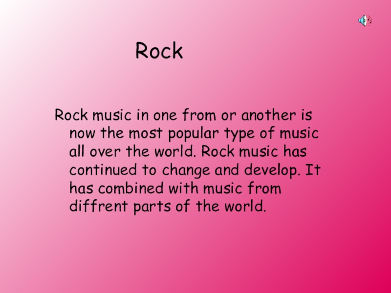popular type of music all over the world. Rock music has continued to change and develop. It has combined with music from diffrent parts of the world.
