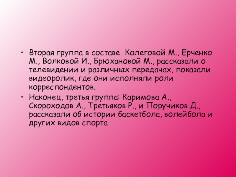 Наконец, третья группа: Каримова А., Скороходов А., Третьяков Р., и Поручиков Д., рассказали об истории баскетбола, волейбола и других видов спорта