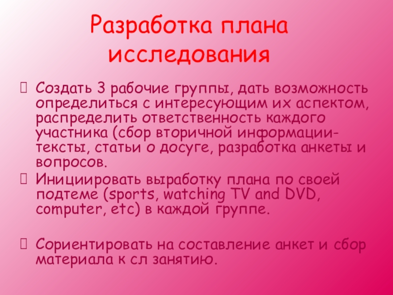 Инициировать выработку плана по своей подтеме (sports, watching TV and DVD, computer, etc) в каждой группе.