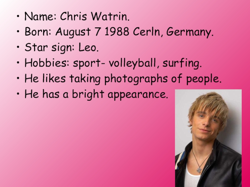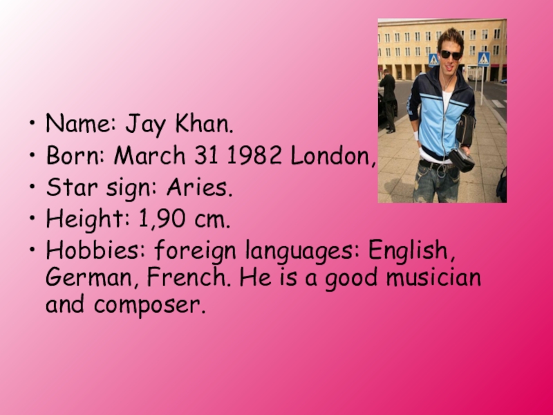 Hobbies: foreign languages: English, German, French. He is a good musician and composer.