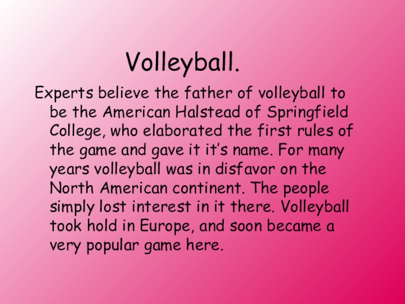 of Springfield College, who elaborated the first rules of the game and gave it it’s name. For many years volleyball was in disfavor on the North American continent. The people simply lost interest in it there. Volleyball took hold in Europe, and soon became a very popular game here.
