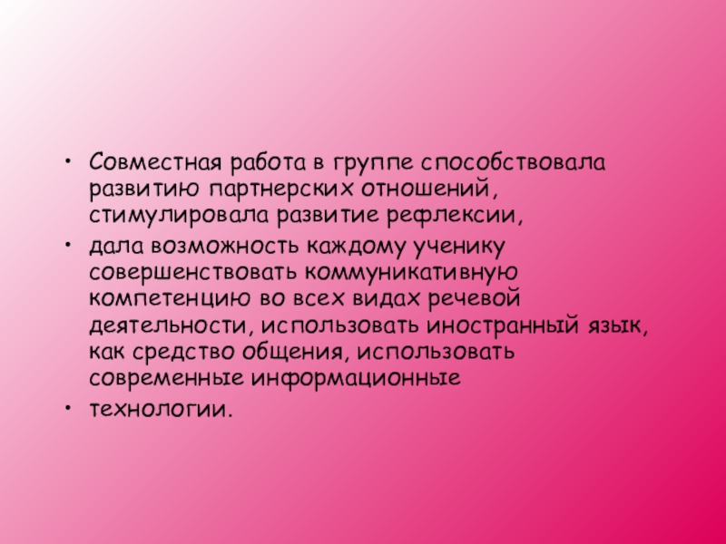Слайд 73Совместная работа в группе способствовала развитию партнерских отношений, стимулировала развитие рефлексии,