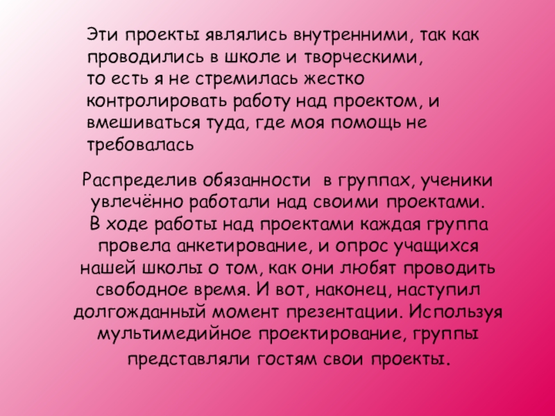 Эти проекты являлись внутренними, так как проводились в школе и творческими,