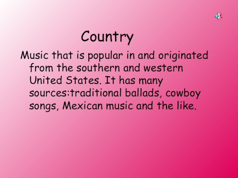 western United States. It has many sources:traditional ballads, cowboy songs, Mexican music and the like.