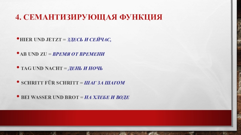 4. Семантизирующая функция hier und jetzt = здесь и сейчас, ab und zu = время от времени Tag und